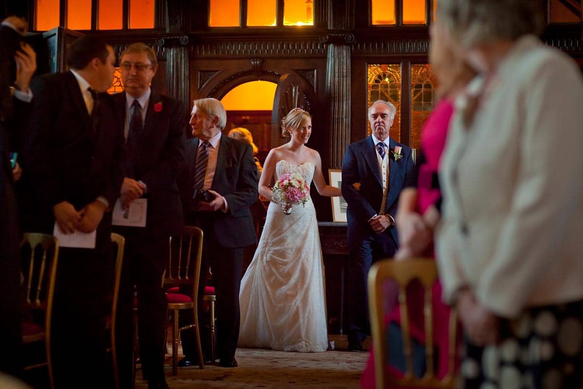 Loseley Park wedding photography. Late afternoon autumn sunshine gave Loseley a fantastic golden hue. Ideal weather for a romantic wedding. With the ceremony in the wood panelled room of this historic building.
